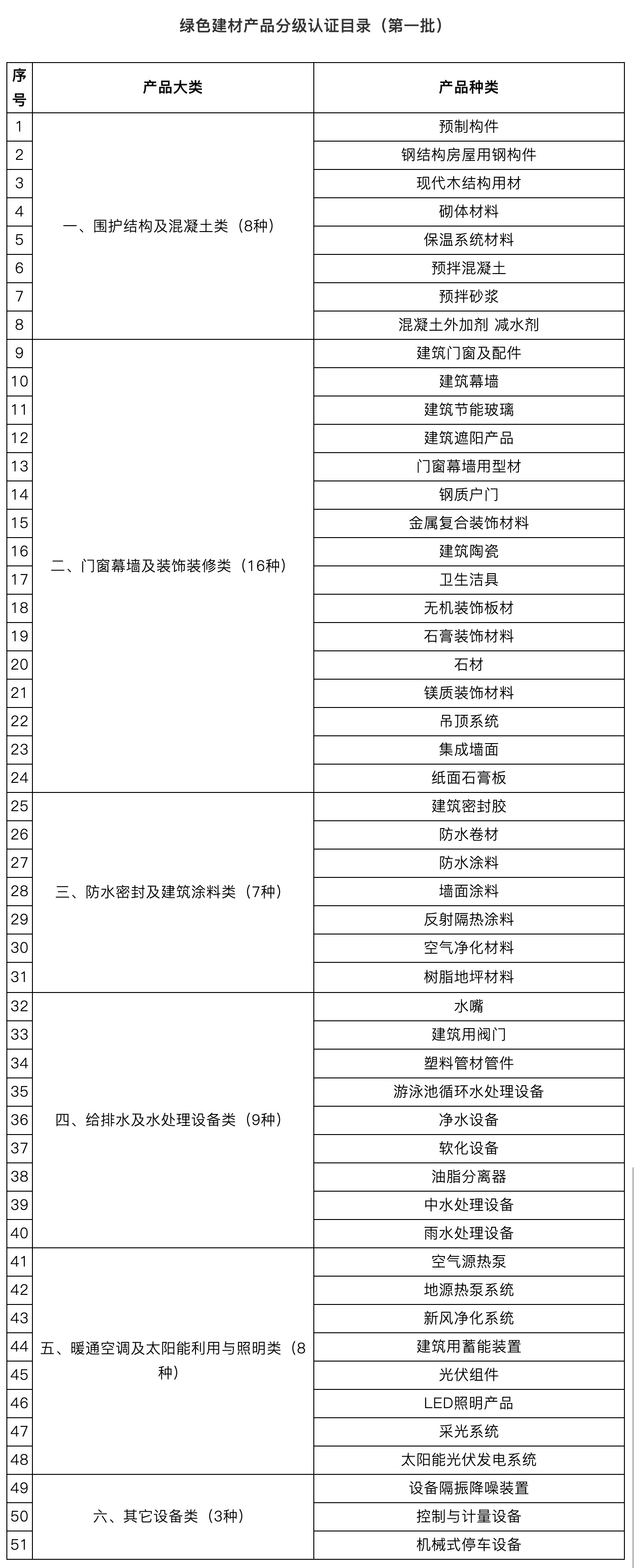 在前期綠色建材評價工作基礎上,加快推進綠色建材產品認證工作,將建筑門窗及配件等51種產品(見附件1)納入綠色建材產品認證實施范圍,按照《實施方案》要求實施分級認證。根據(jù)行業(yè)發(fā)展和認證工作需要,三部門還將適時把其他建材產品納入實施范圍。