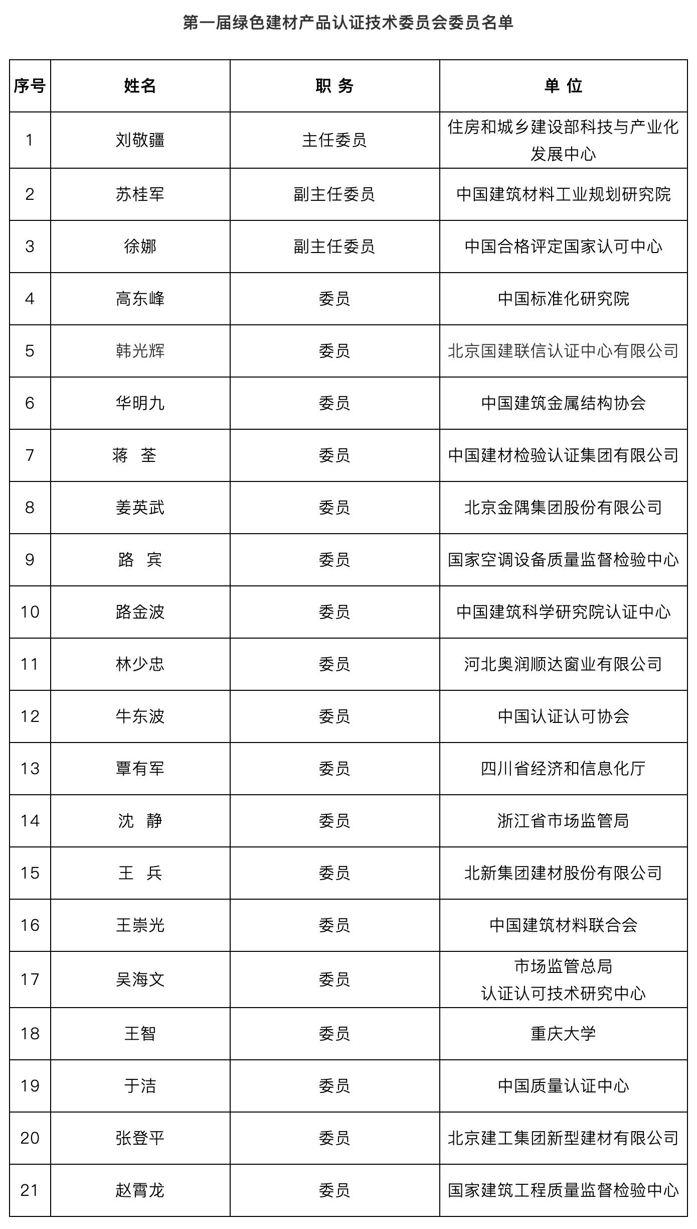 組建綠色建材產品認證技術委員會,為綠色建材產品認證工作提供決策咨詢和技術支持。第一屆技術委員會委員名單附后(見附件3),秘書處設在中國建筑材料工業(yè)規(guī)劃研究院,負責技術委員會日常工作。