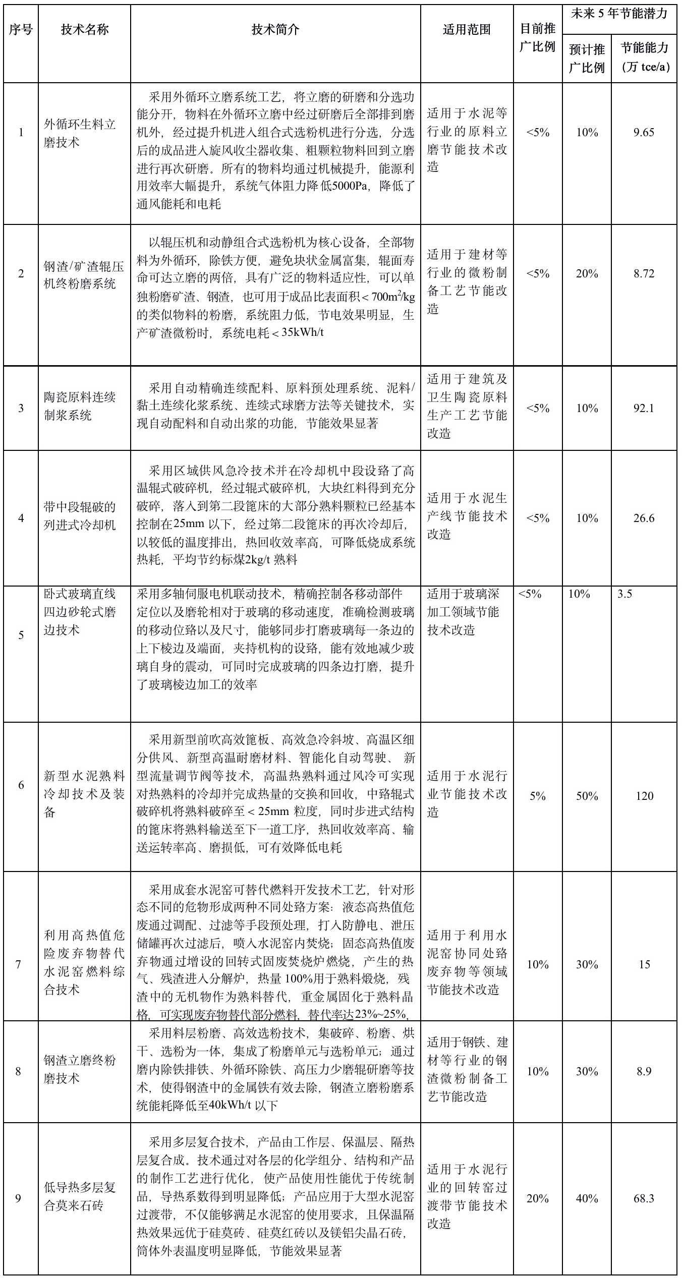 本次公示的工業(yè)節(jié)能技術目錄按技術類別劃分為流程工業(yè)節(jié)能改造技術、余熱余壓節(jié)能改造技術、重點用能設備系統(tǒng)節(jié)能技術、能源信息化管控技術、其他工業(yè)節(jié)能技術等大類。建材行業(yè)水泥、玻璃、陶瓷、耐火材料等領域有多項技術入圍推薦目錄(清單見下表)。