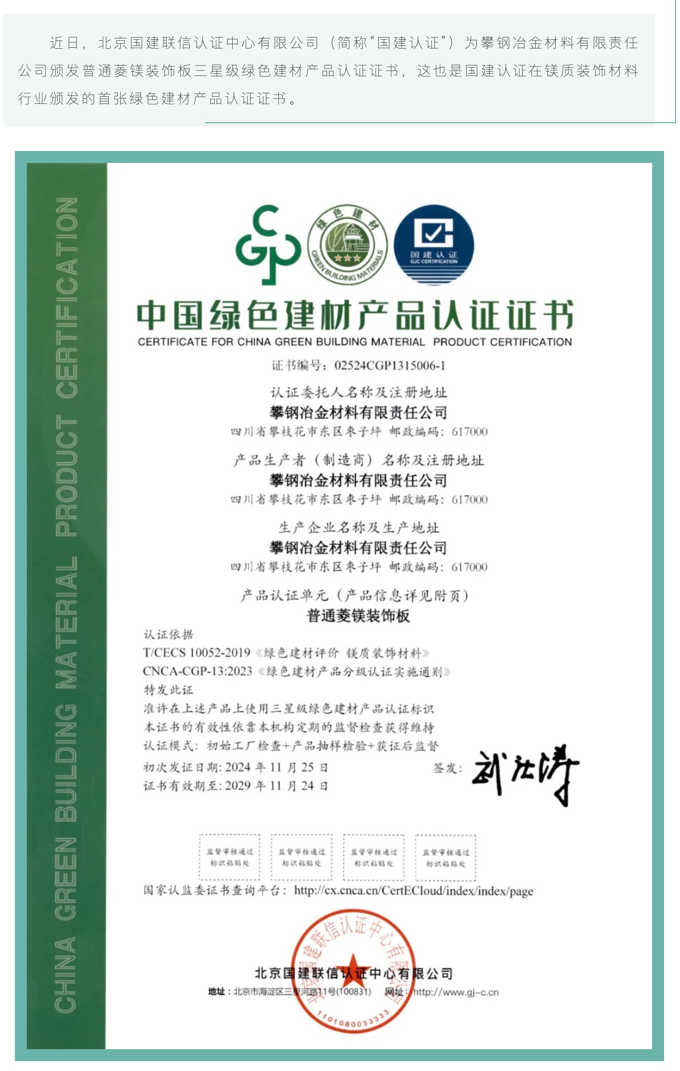 國建認(rèn)證頒發(fā)首張鎂質(zhì)裝飾材料綠色建材產(chǎn)品認(rèn)證證書