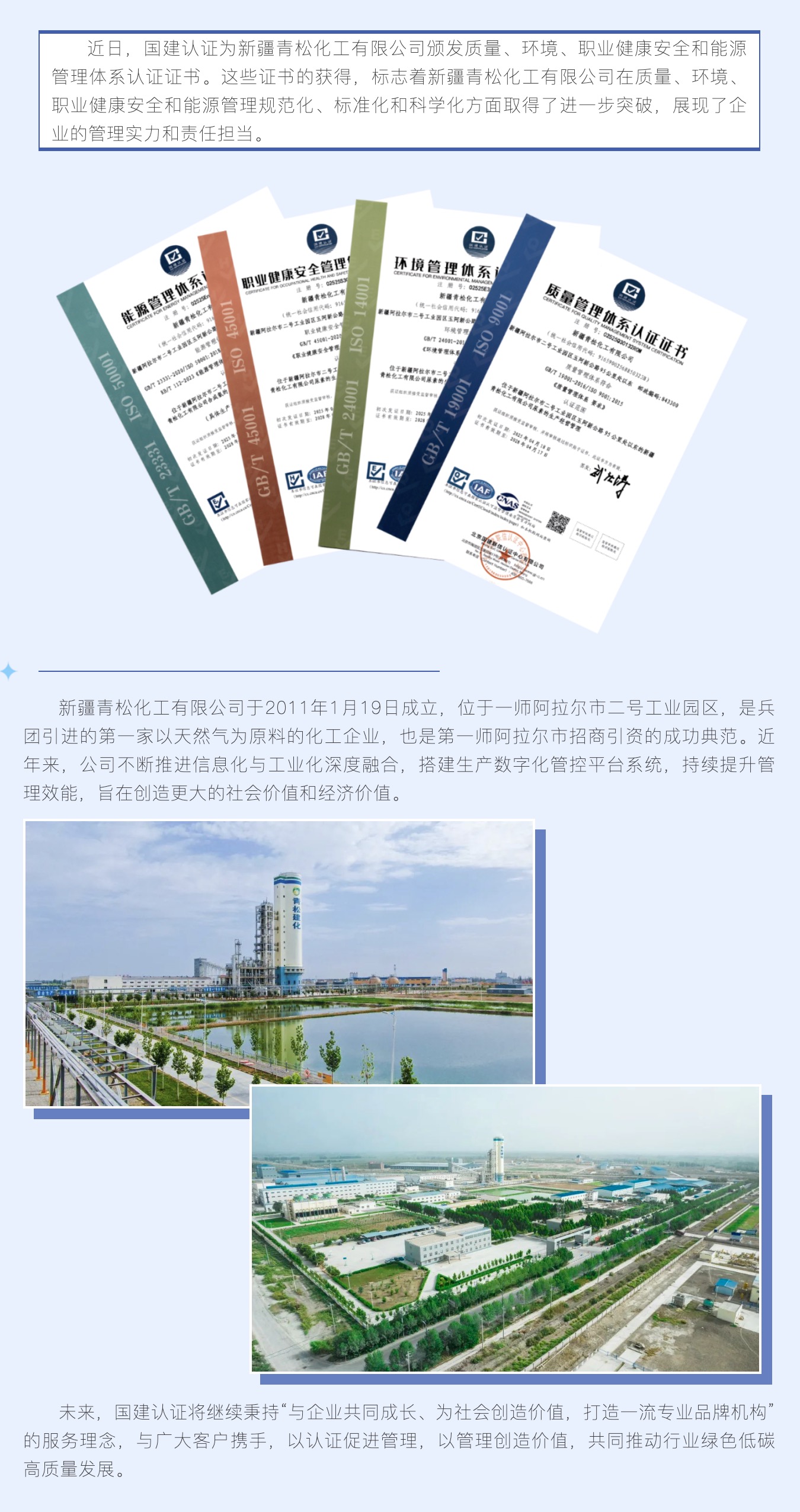 國建認(rèn)證為新疆青松化工頒發(fā)管理體系認(rèn)證證書