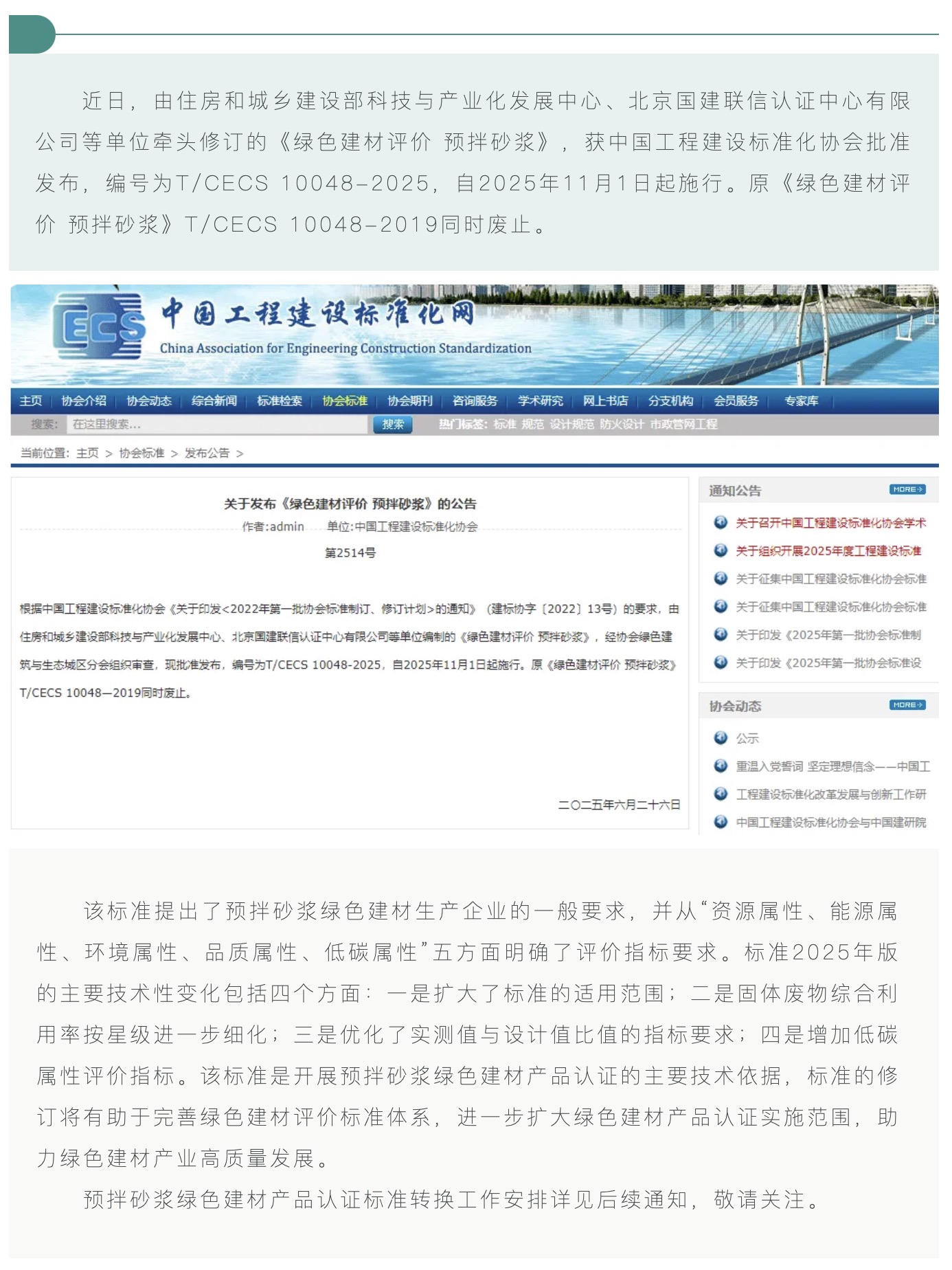 國建認(rèn)證聯(lián)合修訂的《綠色建材評價(jià) 預(yù)拌砂漿》標(biāo)準(zhǔn)獲批發(fā)布