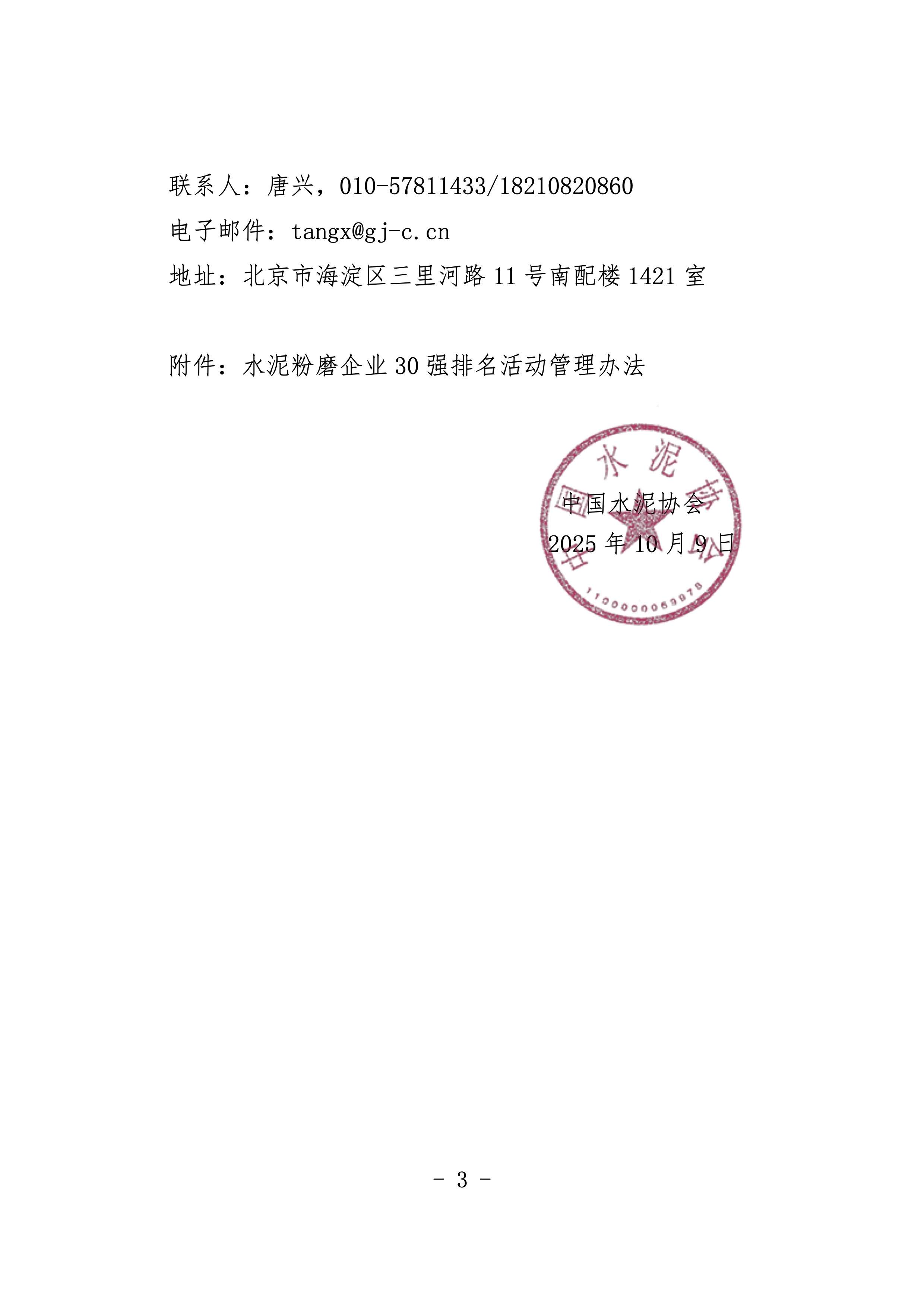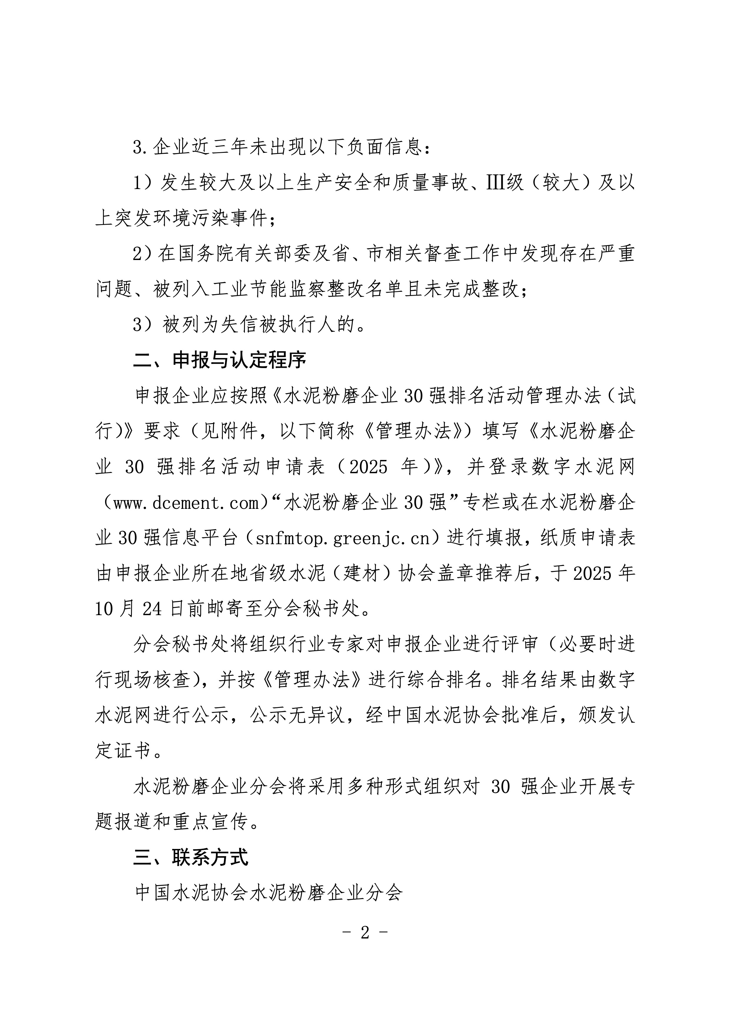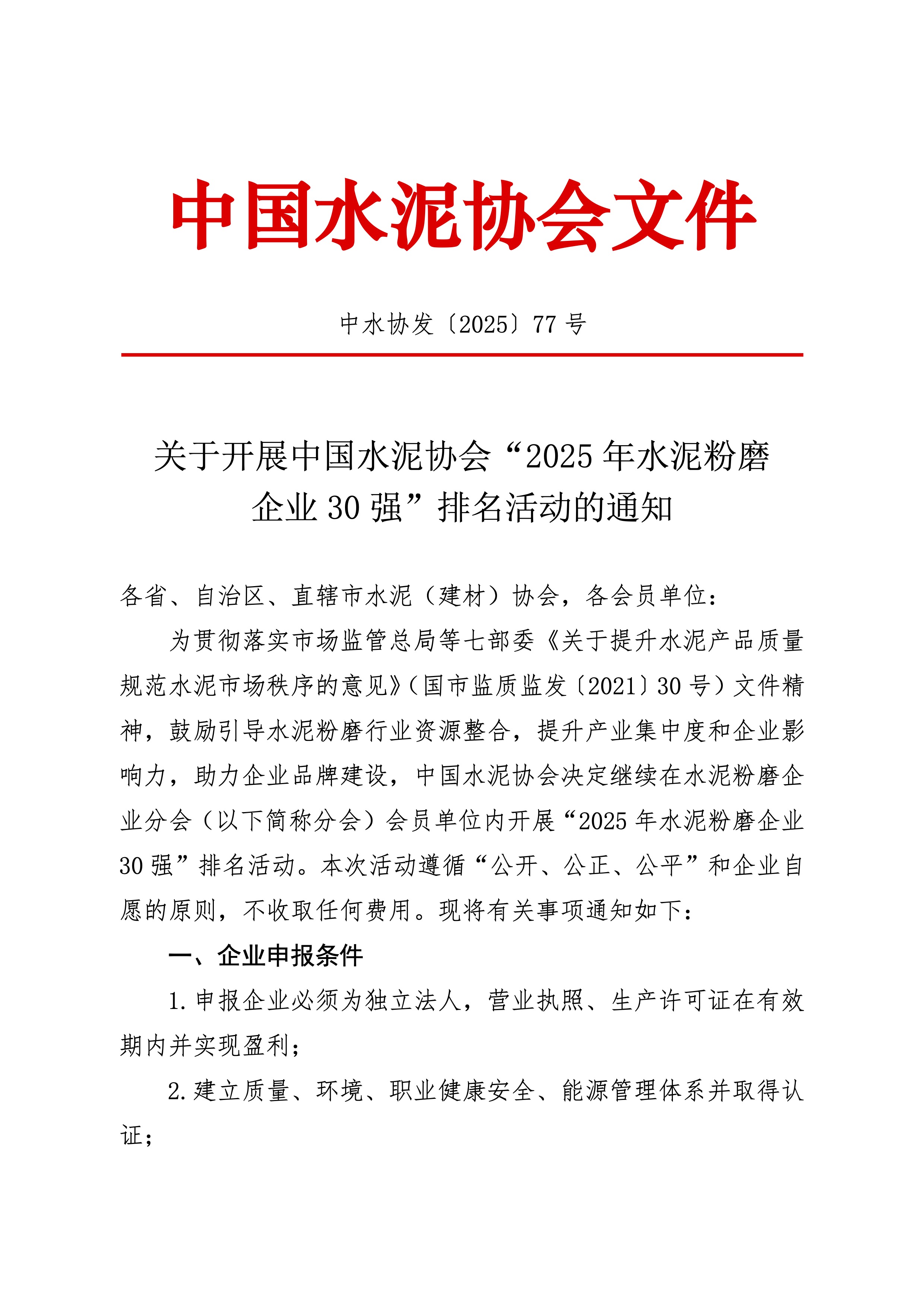 關(guān)于開展中國水泥協(xié)會“2025 年水泥粉磨 企業(yè) 30 強(qiáng)”排名活動的通知