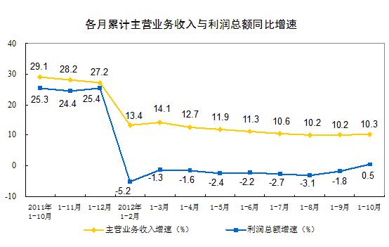 1-10月份全國規(guī)模以上工業(yè)企業(yè)實現(xiàn)利潤同比增長0.5%