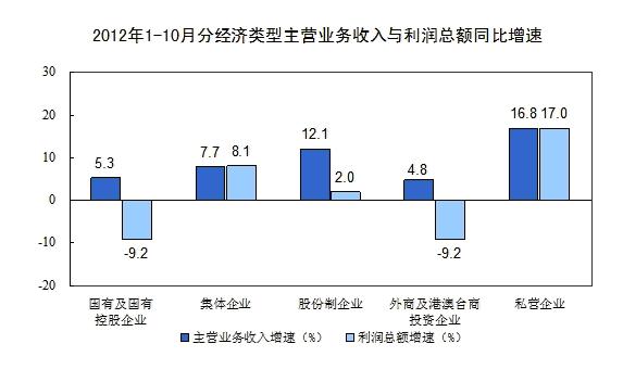 在規(guī)模以上工業(yè)企業(yè)中,國有及國有控股企業(yè)實現(xiàn)主營業(yè)務(wù)收入196438億元,同比增長5.3%,每百元主營業(yè)務(wù)收入中的成本為82.7元,主營業(yè)務(wù)收入利潤率為5.74%;集體企業(yè)實現(xiàn)主營業(yè)務(wù)收入9492億元,同比增長7.7%,每百元主營業(yè)務(wù)收入中的成本為85.34元,主營業(yè)務(wù)收入利潤率為6.63%;股份制企業(yè)實現(xiàn)主營業(yè)務(wù)收入425052億元,同比增長12.1%,每百元主營業(yè)務(wù)收入中的成本為85.2元,主營業(yè)務(wù)收入利潤率為5.53%;外商及港澳臺商投資企業(yè)實現(xiàn)主營業(yè)務(wù)收入179612億元,同比增長4.8%,每百元主營業(yè)務(wù)收入中的成本為86.42元,主營業(yè)務(wù)收入利潤率為5.12%;私營企業(yè)實現(xiàn)主營業(yè)務(wù)收入225450億元,同比增長16.8%,每百元主營業(yè)務(wù)收入中的成本為86.44元,主營業(yè)務(wù)收入利潤率為5.6%。