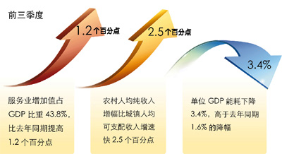 從產(chǎn)業(yè)結(jié)構(gòu)看,農(nóng)業(yè)生產(chǎn)形勢喜人,糧食產(chǎn)量實(shí)現(xiàn)歷史性的“九連增”,前三季度服務(wù)業(yè)增加值占GDP比重比去年同期提高1.2個(gè)百分點(diǎn)。
