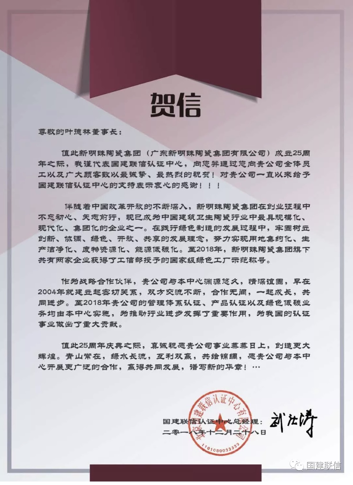 國建認(rèn)證賀新明珠集團(tuán)成立25周年