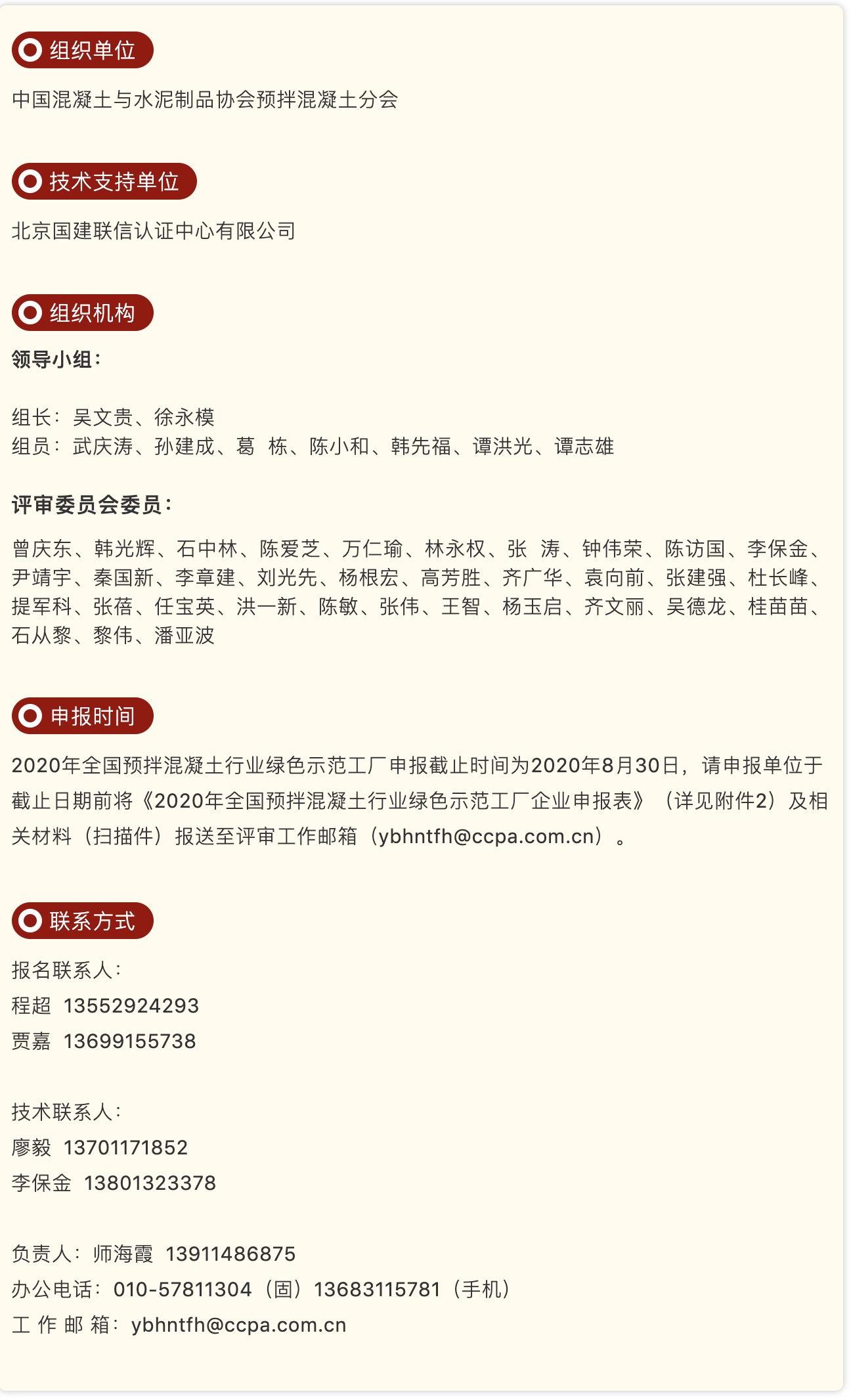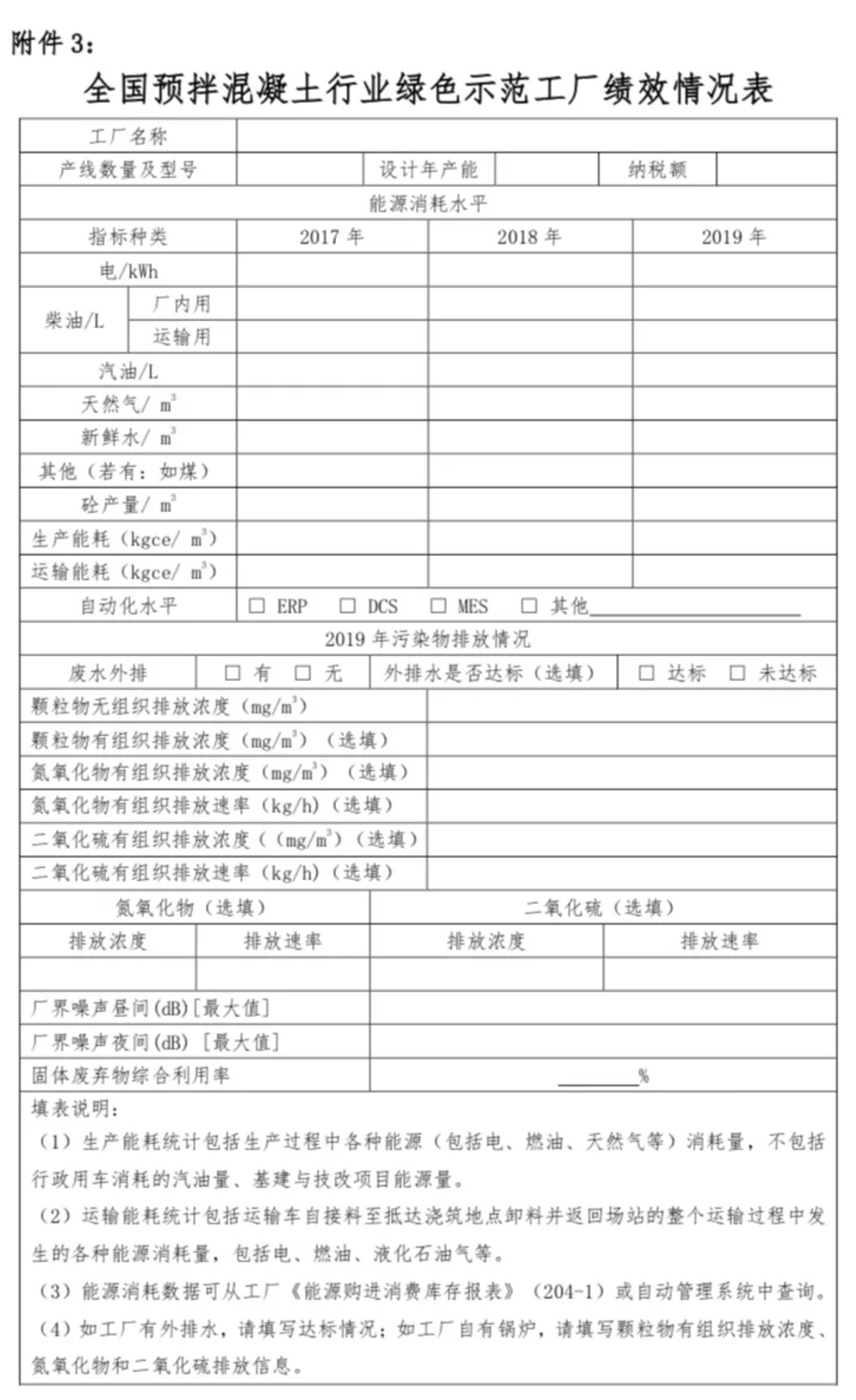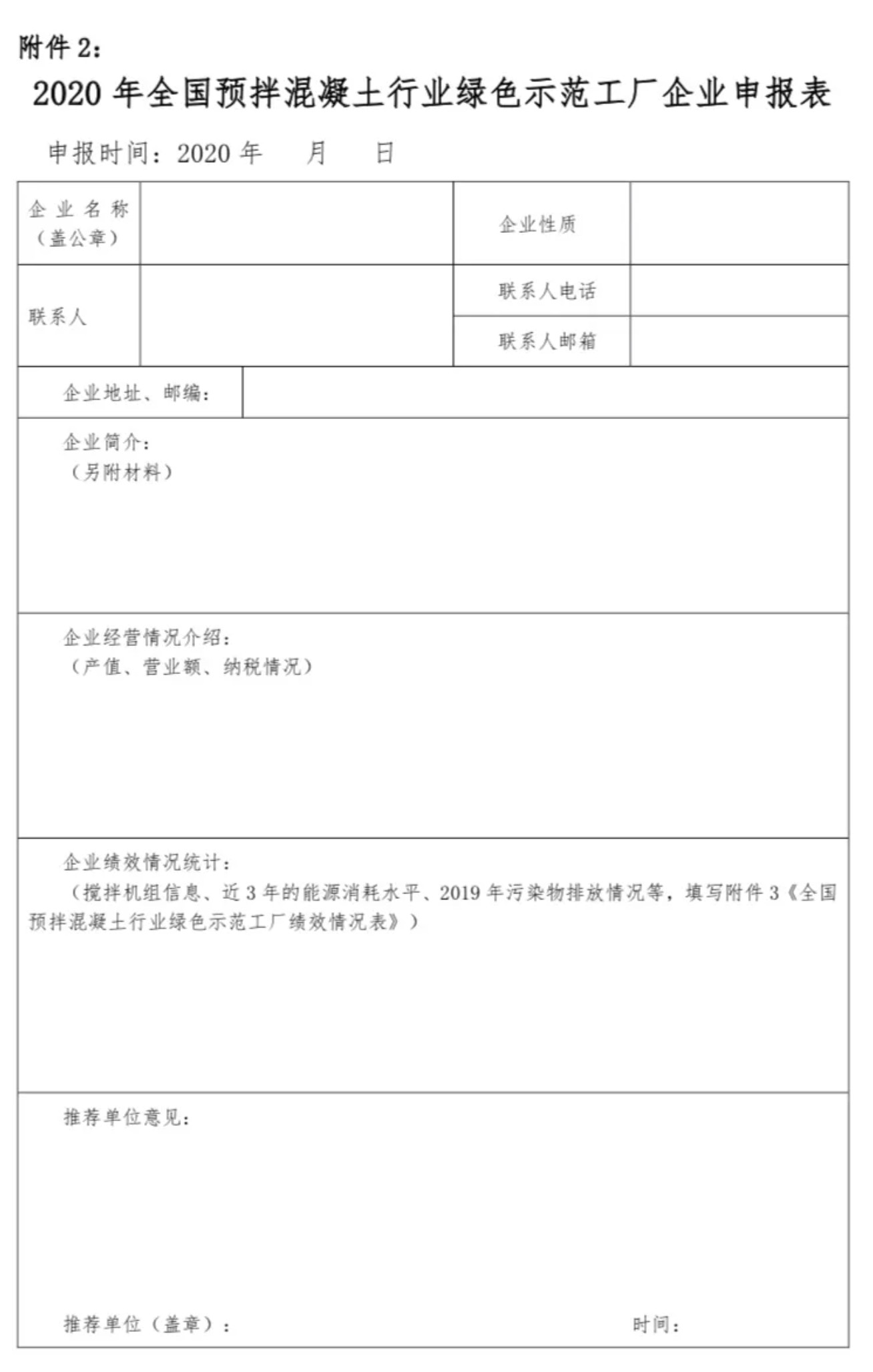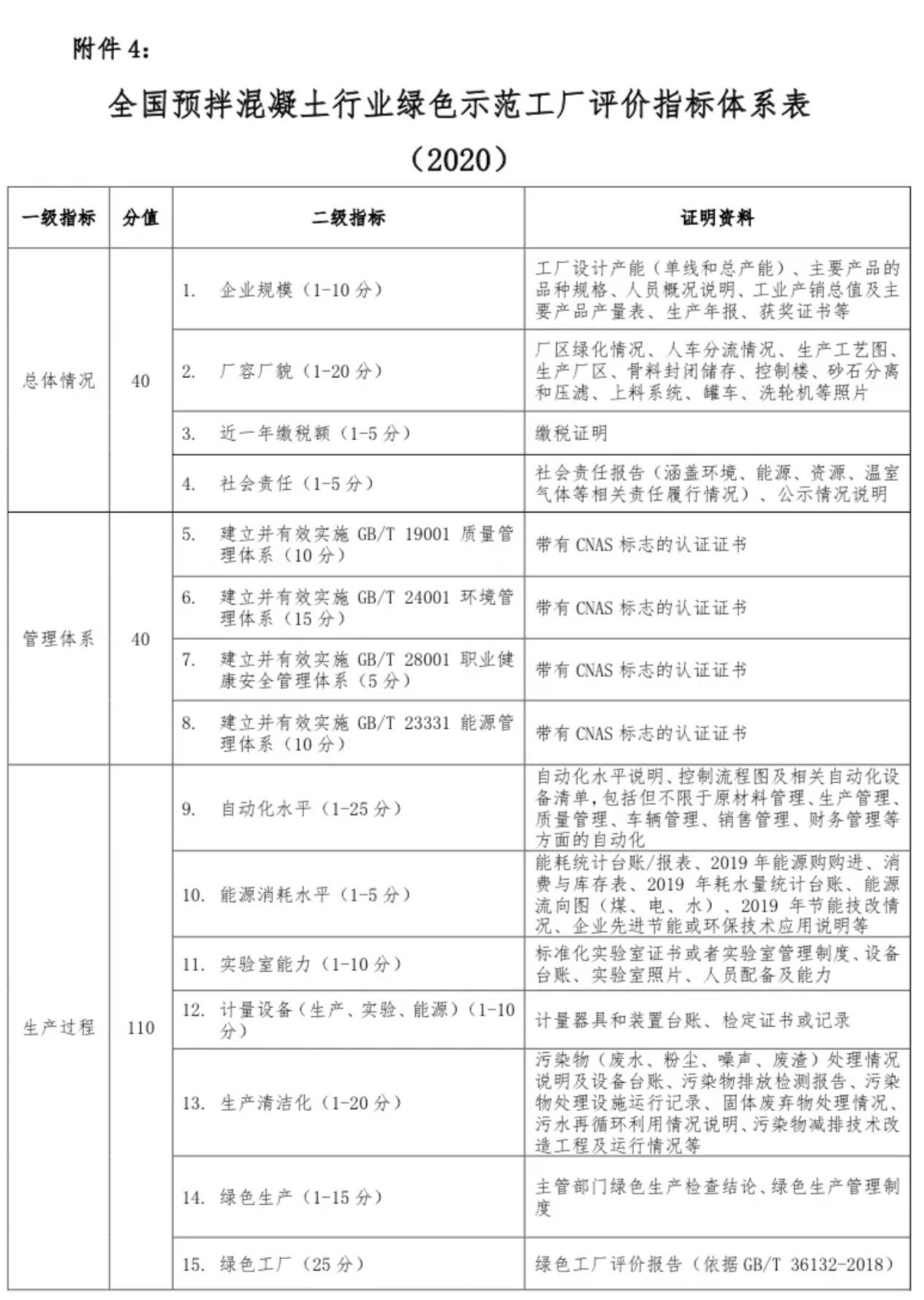 第九條 全國預(yù)拌混凝土行業(yè)綠色示范工廠的申報(bào)采取企業(yè)自愿申報(bào)與省市相關(guān)行業(yè)協(xié)會(huì)推薦相結(jié)合的方式進(jìn)行。第十條 申報(bào)時(shí)須填寫統(tǒng)一格式的《2020年全國預(yù)拌混凝土行業(yè)綠色示范工廠企業(yè)申報(bào)表》,按照“全國預(yù)拌混凝土行業(yè)綠色示范工廠評(píng)價(jià)指標(biāo)體系表(2020)”提供必要的證明和評(píng)價(jià)材料(電子版)?!?020年全國預(yù)拌混凝土行業(yè)綠色示范工廠企業(yè)申報(bào)表》及相關(guān)材料應(yīng)當(dāng)完整、真實(shí)、可靠。