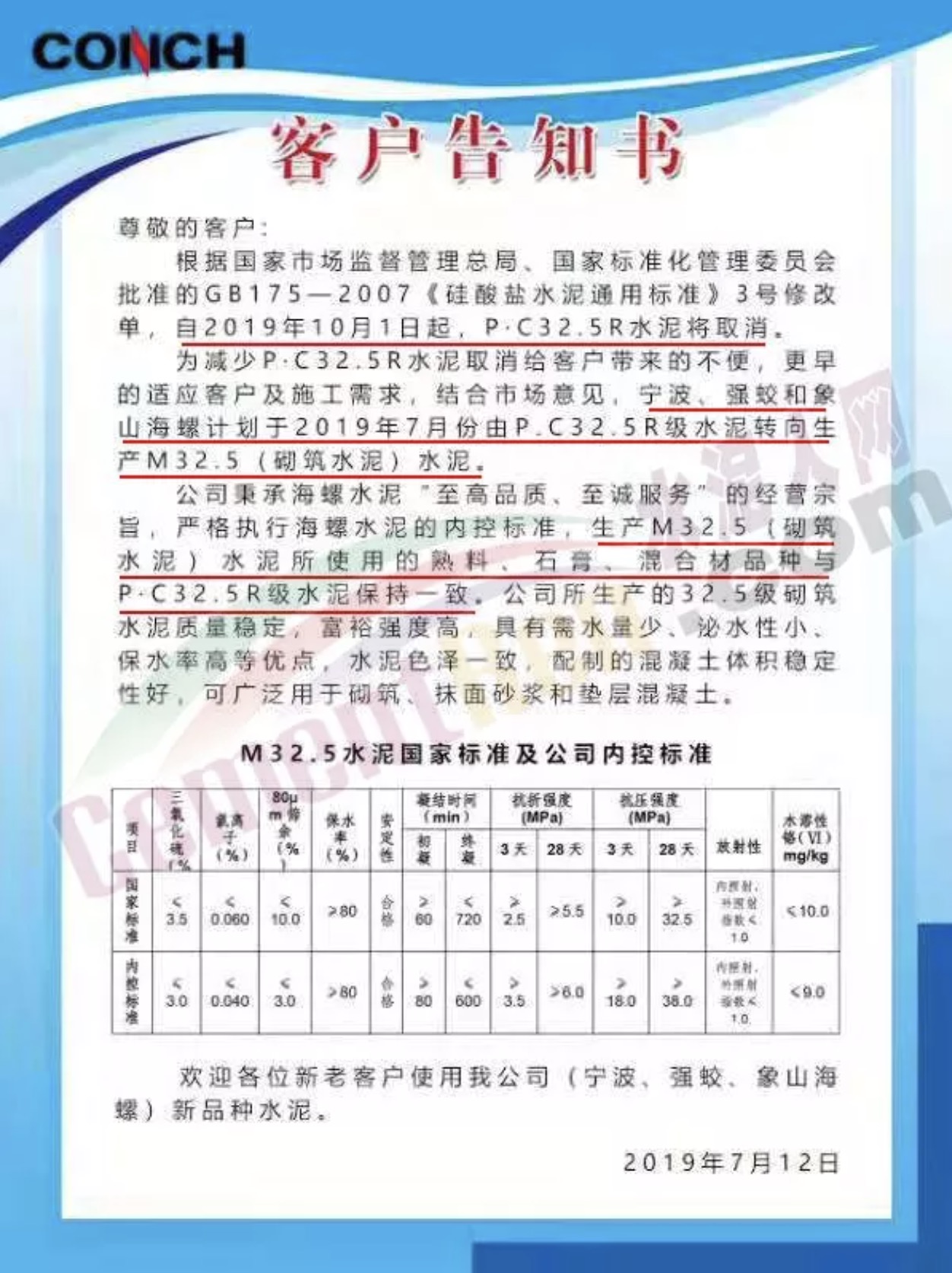 日前,海螺水泥發(fā)布客戶告知書稱根據(jù)國家市場(chǎng)監(jiān)管總局、國家標(biāo)委會(huì)批準(zhǔn)GB175-2007《硅酸鹽水泥通用標(biāo)準(zhǔn)》3號(hào)修改單,自2019年10月1日起,P.C32.5R水泥將取消。