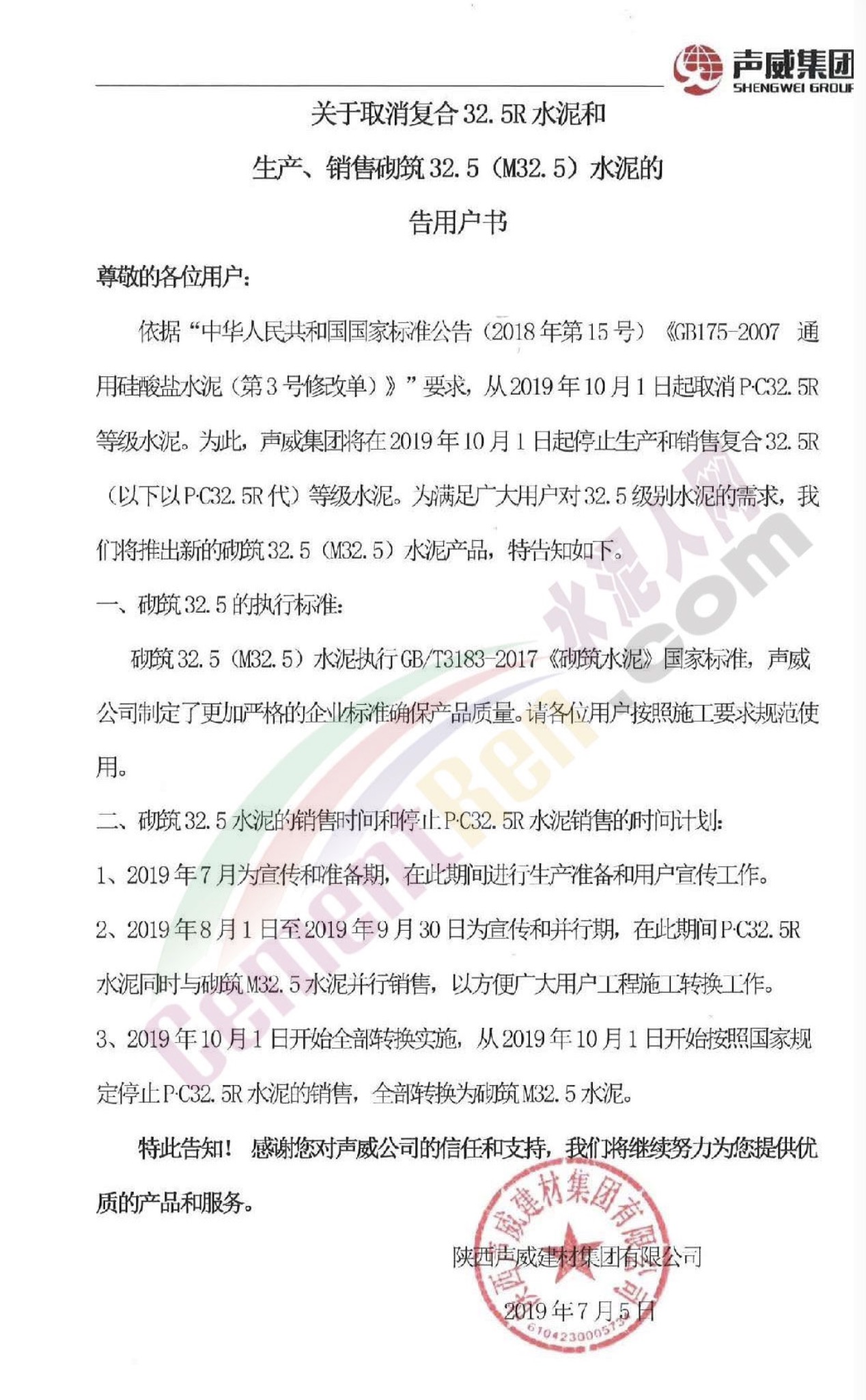 陜西聲威集團(tuán)的告用戶書稱:根據(jù)“中華人民共和國國家標(biāo)準(zhǔn)公告(2018年第15號(hào))《GB175-2007通用硅酸鹽水泥(第3號(hào)修改單)》”要求,從2019年10月1日起取消PC32.5R等級(jí)水泥。為此聲威集團(tuán)將在2019年10月1日起停止生產(chǎn)和銷售復(fù)合32.5R(以下以PC32.5R代)等級(jí)水泥。為滿足廣大用戶對(duì)32.5級(jí)別水泥的需求,聲威集團(tuán)將推出新的砌筑32.5(M32.5)水泥產(chǎn)品。