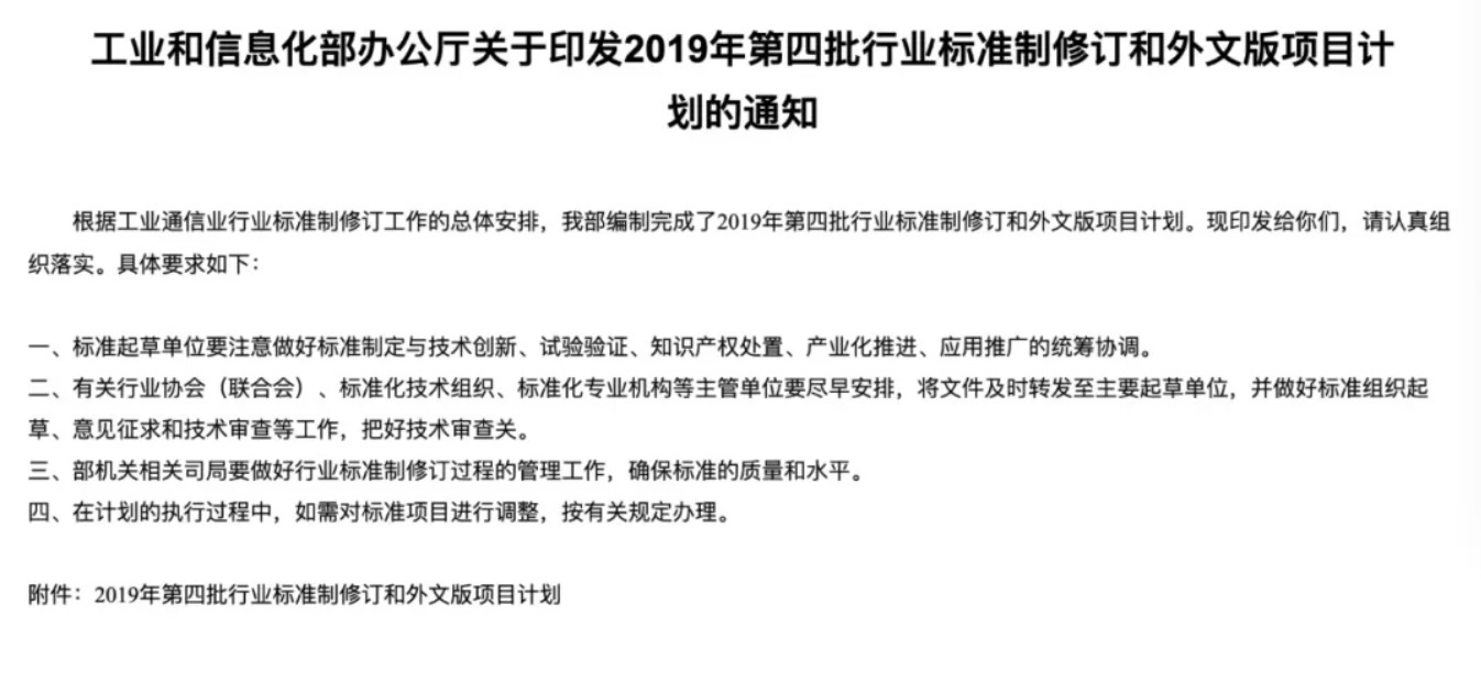 工業(yè)和信息化部辦公廳關(guān)于印發(fā)2019年第四批行業(yè)標(biāo)準(zhǔn)制修訂和外文版項(xiàng)目計(jì)劃的通知