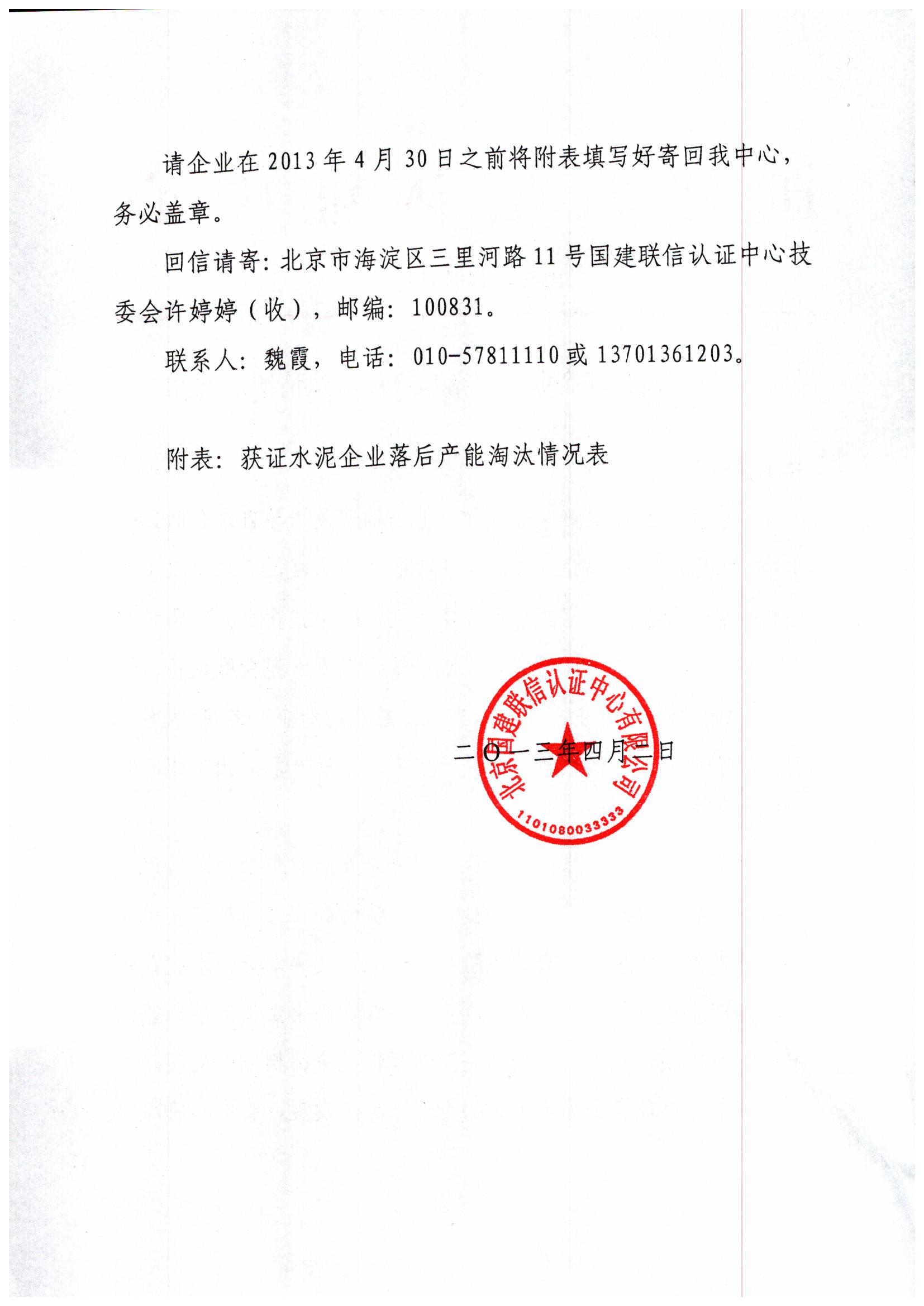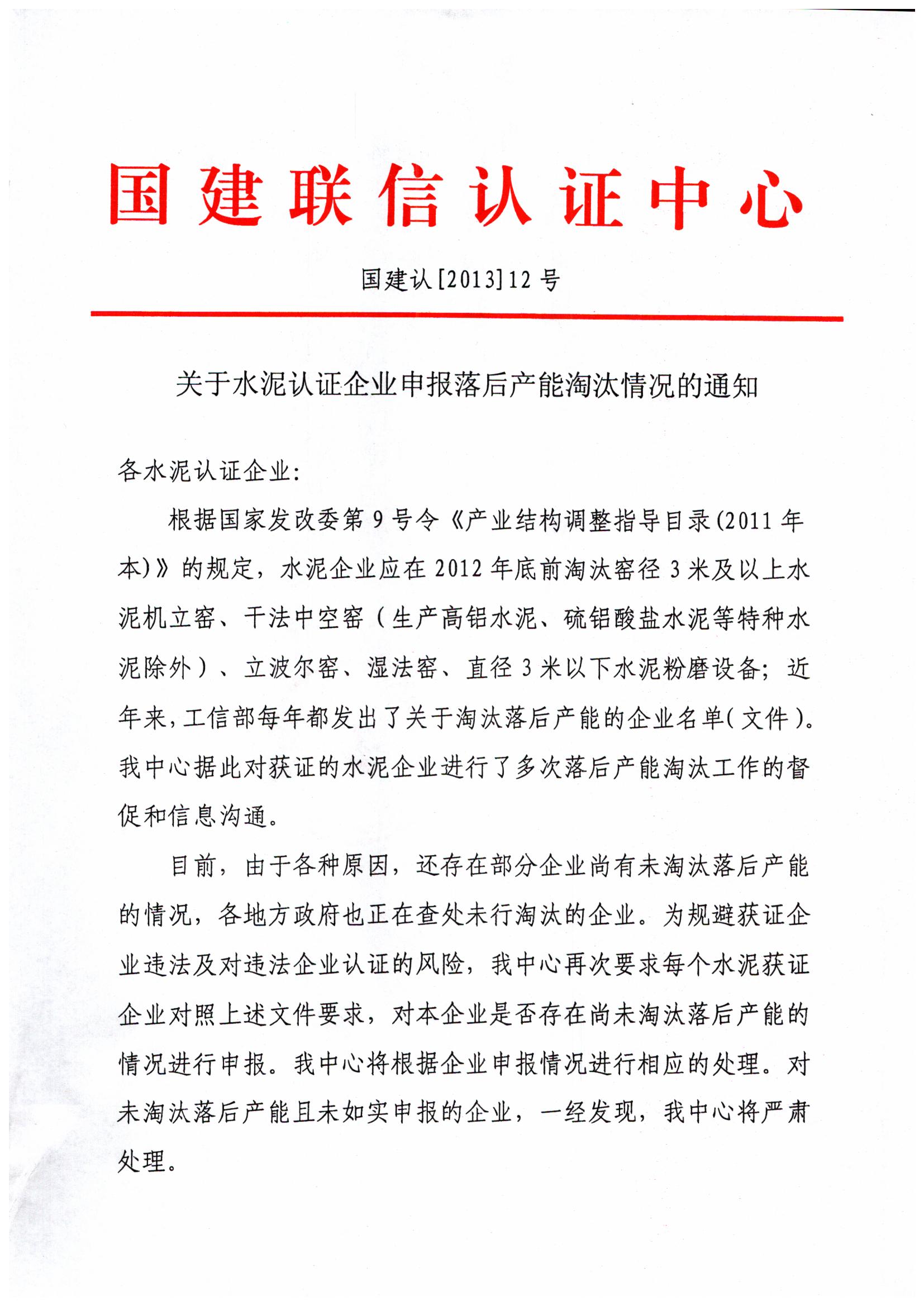 關(guān)于水泥認(rèn)證企業(yè)申報(bào)落后產(chǎn)能淘汰情況的通知