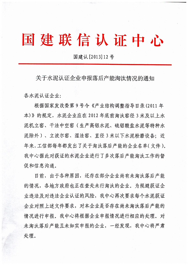 關(guān)于水泥認證企業(yè)申報落后產(chǎn)能淘汰情況的通知