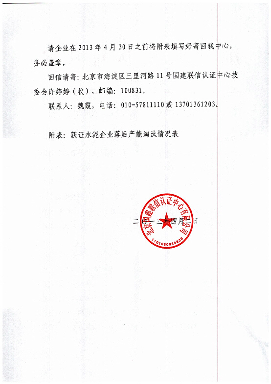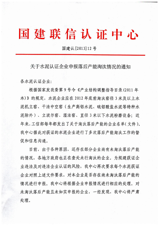 關于水泥認證企業(yè)申報落后產(chǎn)能淘汰情況的通知
