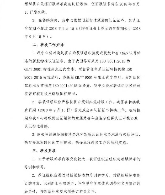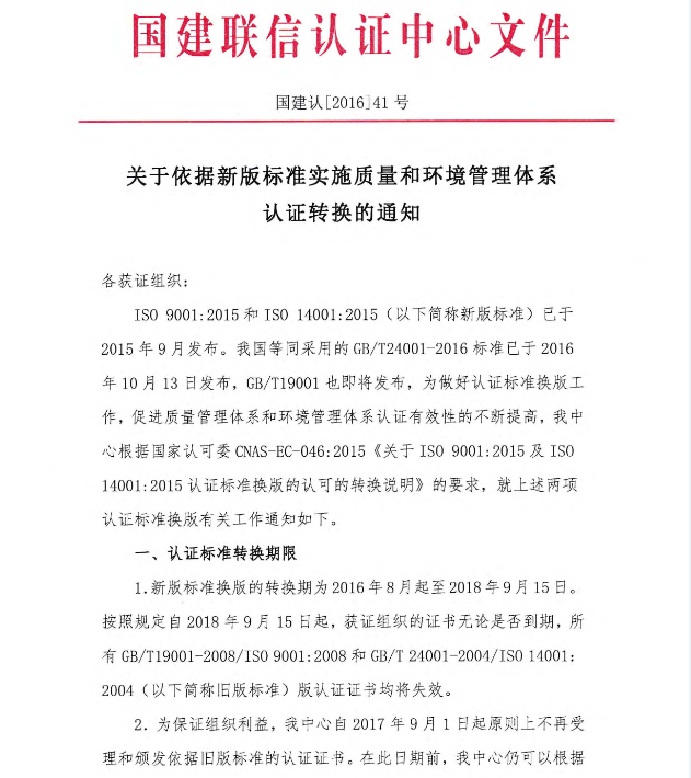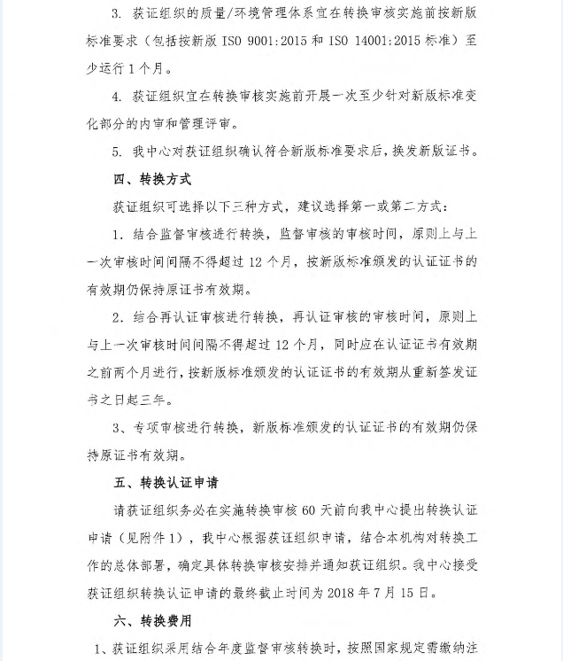 關(guān)于依據(jù)新版標(biāo)準(zhǔn)實(shí)施質(zhì)量和環(huán)境管理體系認(rèn)證轉(zhuǎn)換的通知