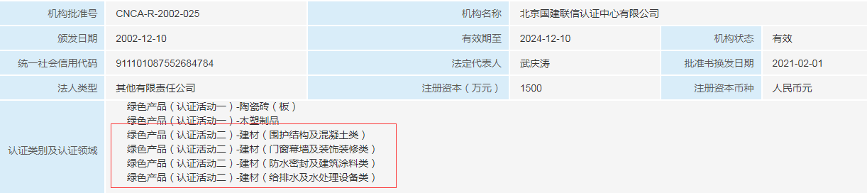 2021年2月1日,北京國建聯(lián)信認證中心有限公司(簡稱國建認證)率先獲批綠色建材產品認證機構資質,成為國內首家綠色建材產品認證機構。認證領域包括圍護結構及混凝土類、門窗幕墻及裝飾裝修類、防水密封及建筑涂料類、給排水及水處理設備類四個大類。產品種類涉及34種建材產品,具體為:預制構件、鋼結構房屋用鋼構件、現(xiàn)代木結構用材、砌體材料、保溫系統(tǒng)材料、預拌混凝土、預拌砂漿、混凝土外加劑減水劑、建筑門窗及配件、建筑幕墻、建筑節(jié)能玻璃、建筑遮陽產品、門窗幕墻用型材、鋼質戶門、金屬復合裝飾材料、建筑陶瓷、衛(wèi)生潔具、無機裝飾板材、石膏裝飾材料、石材、鎂質裝飾材料、吊頂系統(tǒng)、集成墻面、紙面石膏板、建筑密封膠、防水卷材、防水涂料、墻面涂料、反射隔熱涂料、空氣凈化材料、樹脂地坪材料、水嘴、建筑用閥門、塑料管材管件。