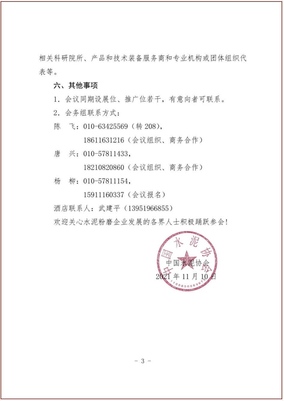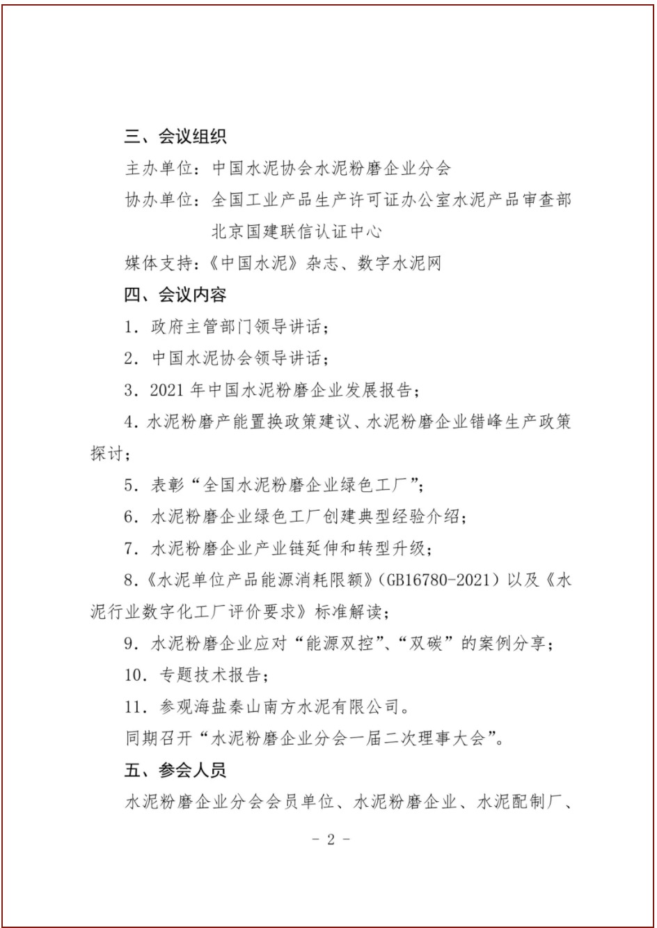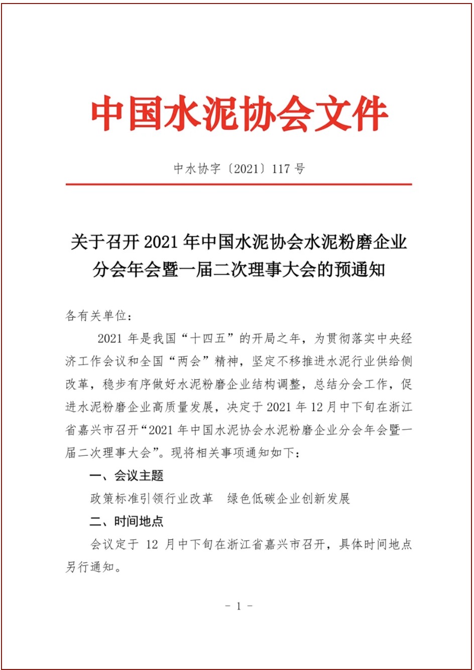 關于召開 2021 年中國水泥協(xié)會水泥粉磨企業(yè) 分會年會暨一屆二次理事大會的預通知