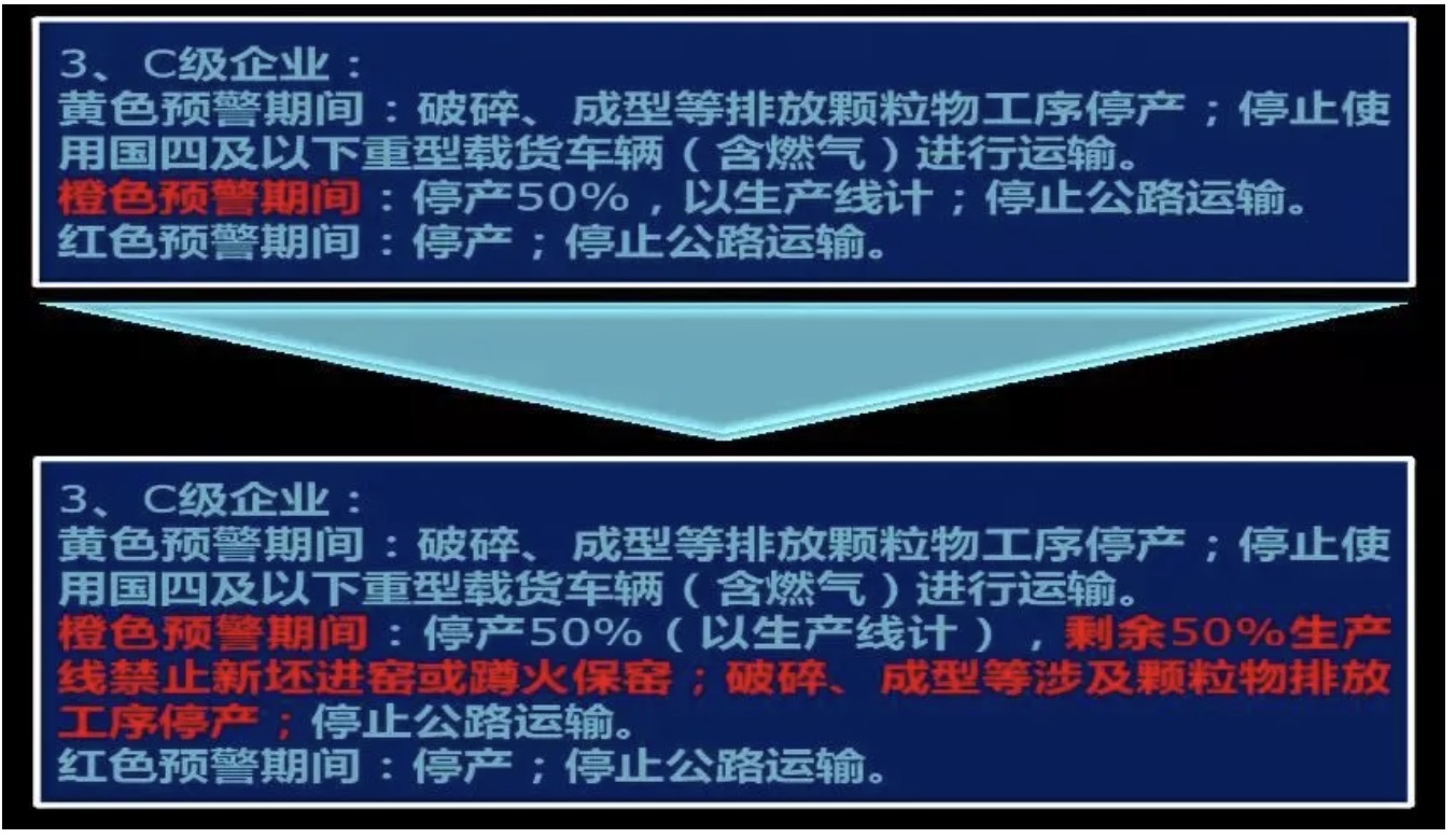 變動原因:開展績效分級工作是為了通過差異化的指標(biāo),鼓勵先進(jìn),鞭策后進(jìn)。水泥行業(yè)B級企業(yè)在橙色預(yù)警期間,采取的減排措施是限產(chǎn)20%,C級企業(yè)是停產(chǎn),體現(xiàn)出了不同級別企業(yè)采取措施的差異性。但在紅色預(yù)警期間,B級和C級企業(yè)都是停產(chǎn),停止國四以下車輛運輸,沒有體現(xiàn)出不同級別采取措施的差異性,無法達(dá)到鼓勵B級,鞭策C級的目的,因此,將C級的措施更改為停產(chǎn),停止公路運輸,體現(xiàn)B級和C級之間的差異。