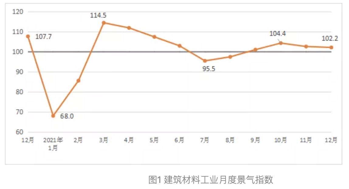 一、2021年12月建筑材料工業(yè)景氣指數(shù)2021年12月份建筑材料工業(yè)景氣指數(shù)為102.2點(diǎn),低于上月0.5個(gè)點(diǎn),高于臨界點(diǎn),處于景氣區(qū)間。12月份建材市場(chǎng)需求呈現(xiàn)低位增長(zhǎng),建材生產(chǎn)延續(xù)平穩(wěn)態(tài)勢(shì),原燃材料價(jià)格較前期回落,建材產(chǎn)品價(jià)格高位回調(diào)。
