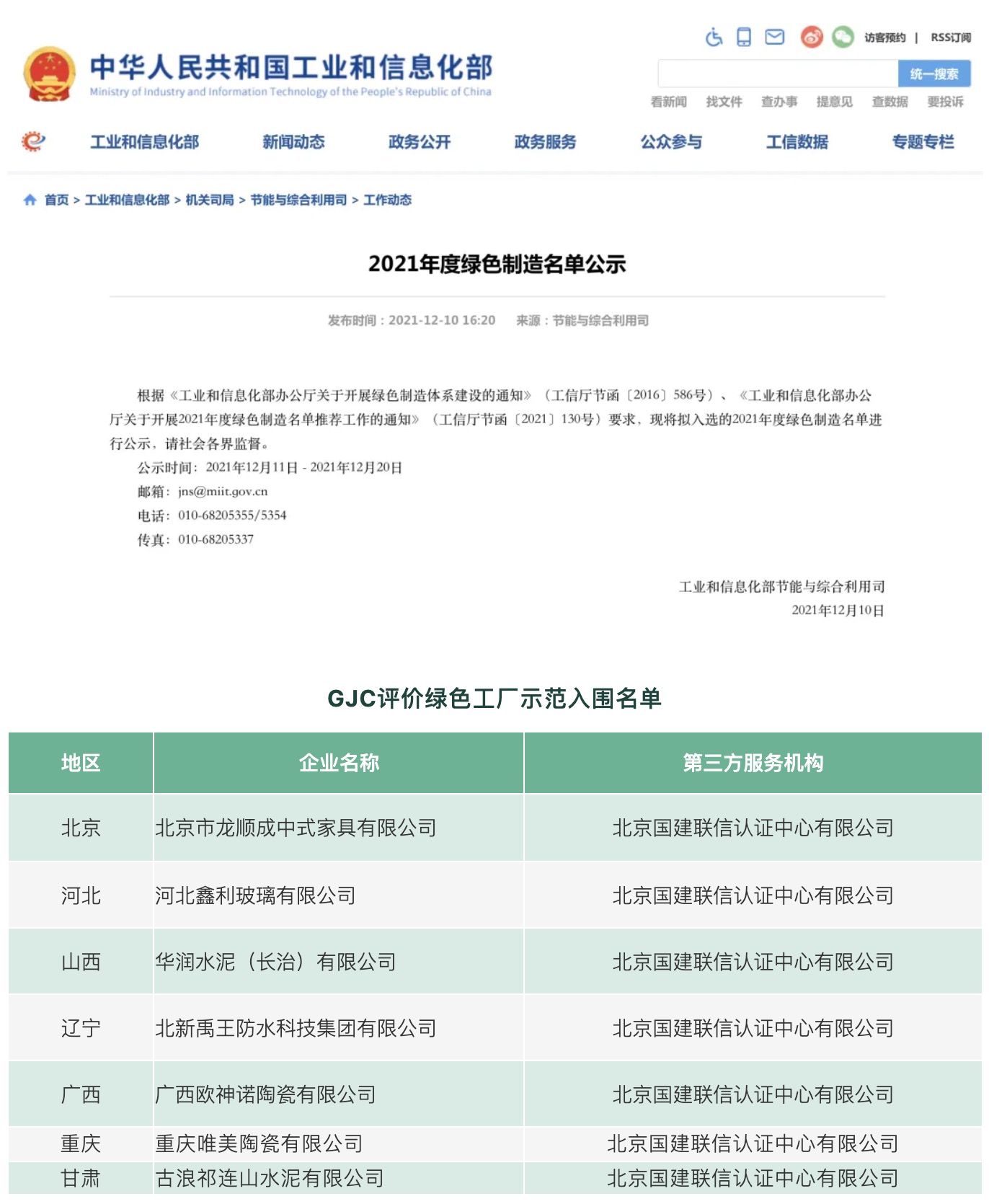 近日,工信部第六批綠色制造示范名單面向社會公示,包括673家綠色工廠、990種綠色設(shè)計產(chǎn)品、52家綠色園區(qū)以及107家綠色供應鏈管理示范企業(yè)入圍。建材行業(yè)有百余家綠色工廠、百余種綠色設(shè)計產(chǎn)品和近十家綠色供應鏈企業(yè)入圍名單,綠色發(fā)展再次取得豐碩成果。國建聯(lián)信認證中心作為建材行業(yè)權(quán)威的綠色低碳服務機構(gòu),憑借專業(yè)化、高水平服務優(yōu)勢,本次共有7家企業(yè)經(jīng)評價入圍綠色工廠示范名單。