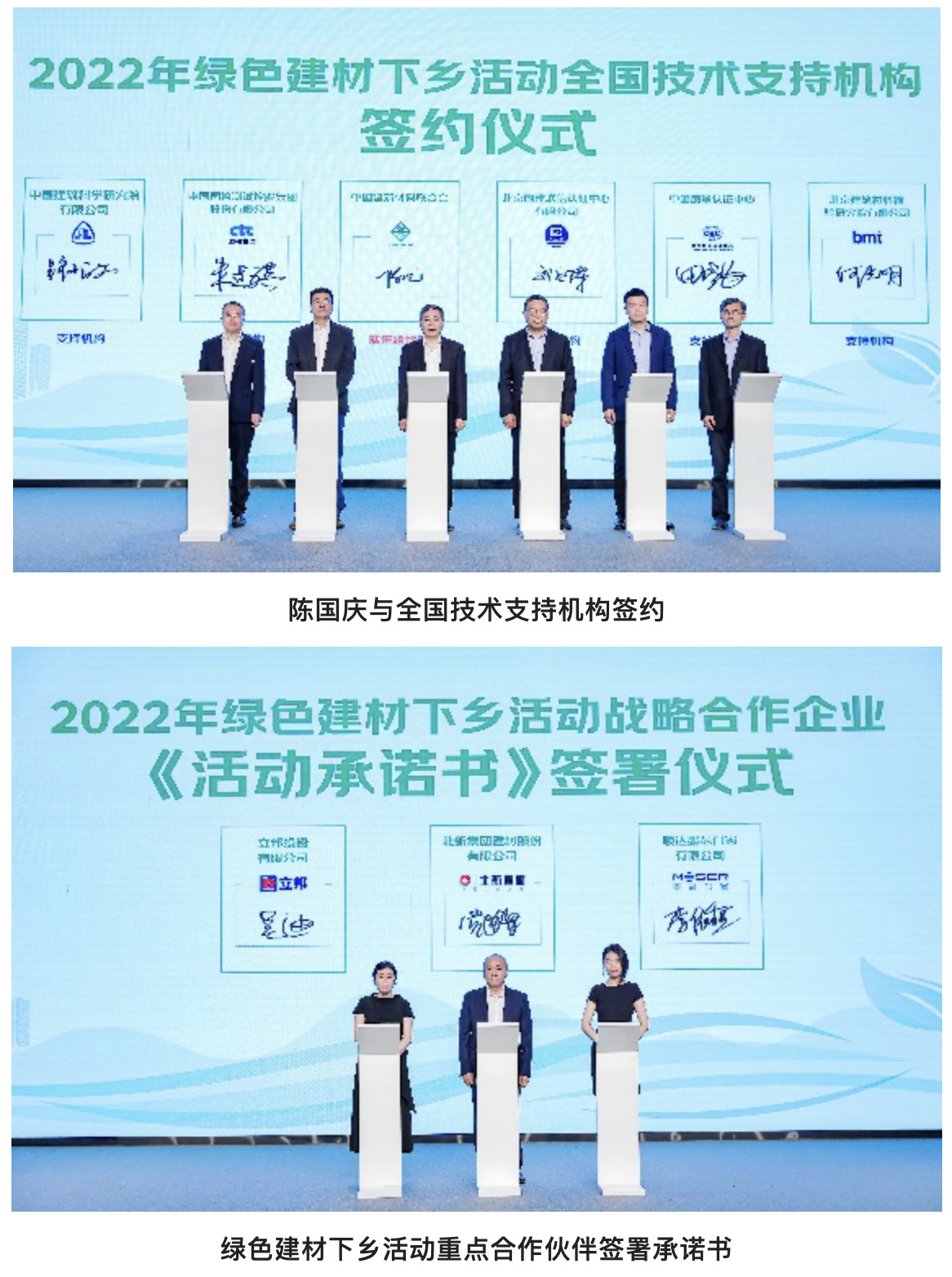 綠色建材下鄉(xiāng)工作推進(jìn)領(lǐng)導(dǎo)小組組長(zhǎng)陳國(guó)慶代表活動(dòng)推進(jìn)組與北京國(guó)建聯(lián)信認(rèn)證中心、中國(guó)國(guó)檢測(cè)試控股集團(tuán)、中國(guó)建筑科學(xué)研究院認(rèn)證中心、中國(guó)質(zhì)量認(rèn)證中心、北京建筑材料檢驗(yàn)研究院等5家國(guó)內(nèi)主流認(rèn)證機(jī)構(gòu)簽署“2022年綠色建材下鄉(xiāng)活動(dòng)全國(guó)技術(shù)支持機(jī)構(gòu)合作協(xié)議”,將委托上述機(jī)構(gòu)配合活動(dòng)推進(jìn)組承擔(dān)為企業(yè)提供產(chǎn)品技術(shù)及認(rèn)證工作等方面咨詢及服務(wù)工作,為綠色建材下鄉(xiāng)活動(dòng)提供全國(guó)技術(shù)支持工作。