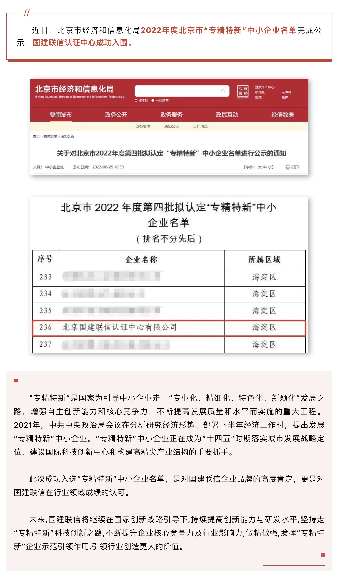 喜訊!國建聯(lián)信入圍北京市2022年度“專精特新”中小企業(yè)名單