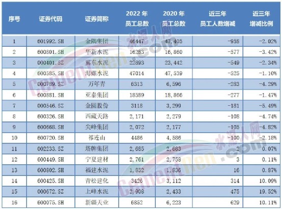 今年以來絕大多數(shù)企業(yè)業(yè)績下滑明顯,員工績效工資相應減少。海螺水泥安全獎已減半,虧損企業(yè)年金也將取消。這些“開支”的減少,也等同于少支付了“部分人的薪水”,變成了另一種意義上的“軟裁員”。紅獅水泥集團總部30%以上人員分流或買斷工齡離職。企業(yè)負責人表示,部分產線因銷量下滑,員工工資隨之下降。但因其底薪相對較高,生產員工流失現(xiàn)象并不嚴重,僅有部分銷售人員辭職。華新水泥、塔牌水泥等此前均有發(fā)布優(yōu)化機構,節(jié)省人力成本的消息,塔牌集團精簡管理機構將原10個部門降為7個部門。近三年金隅集團、華新水泥、冀東水泥、海螺水泥等10家企業(yè)減員超100人及以上,其中金隅集團減員958人,華新、冀東、海螺減員500人以上。