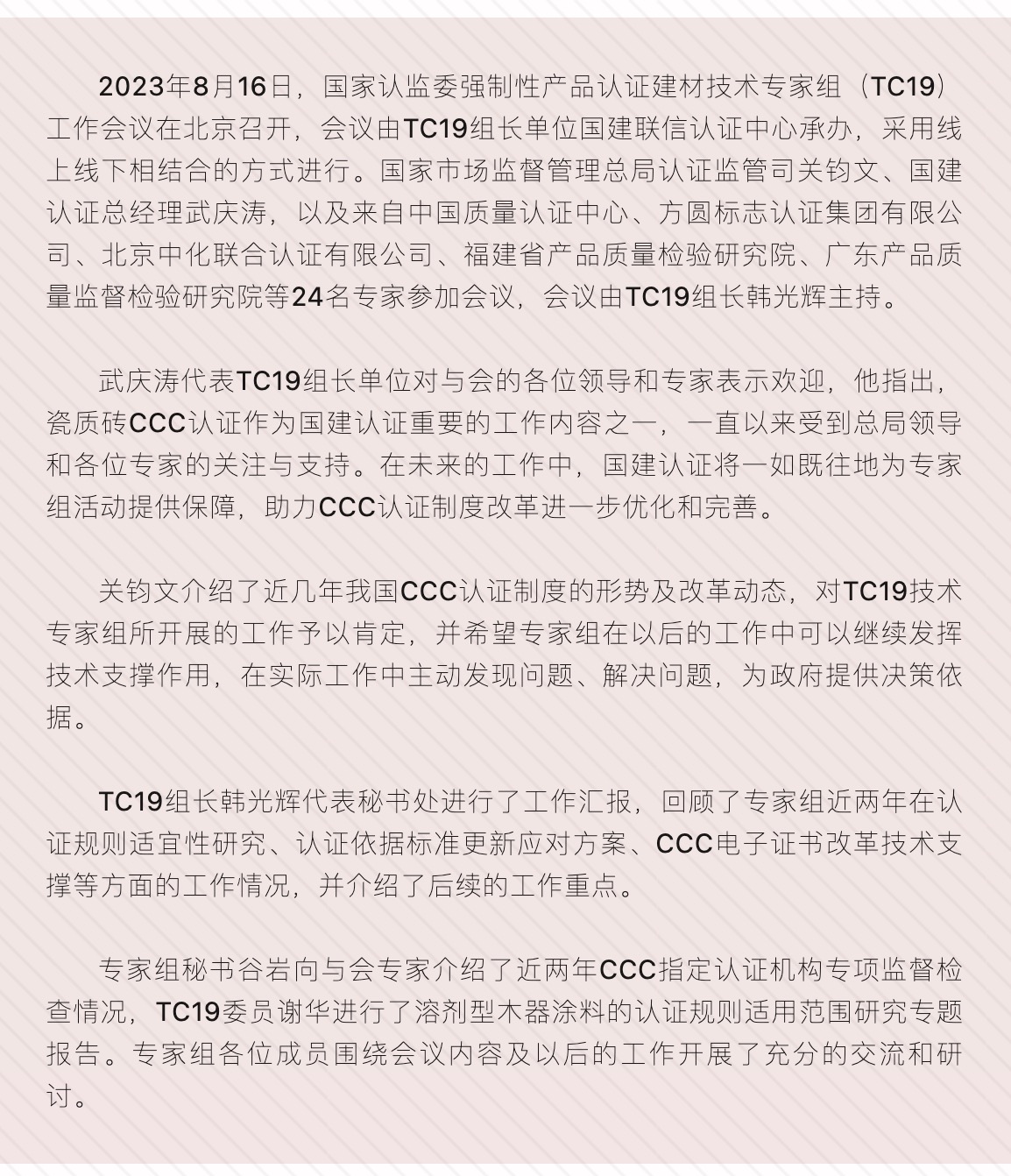 強制性產(chǎn)品認證建材技術(shù)專家組(TC19)工作會議在京召開