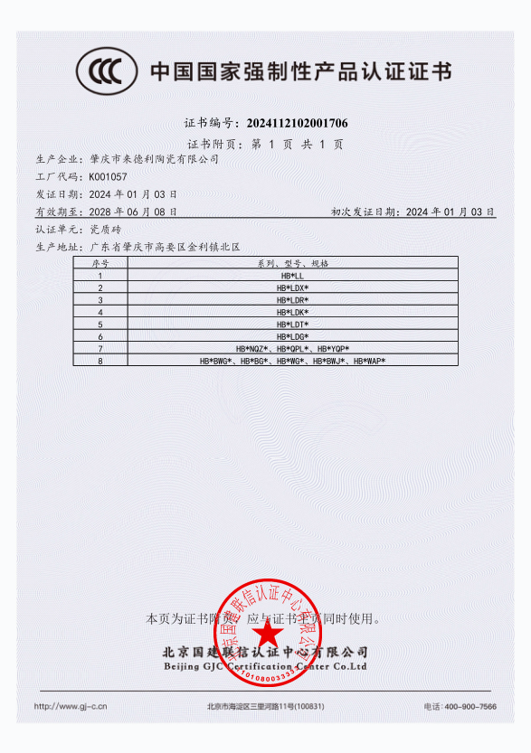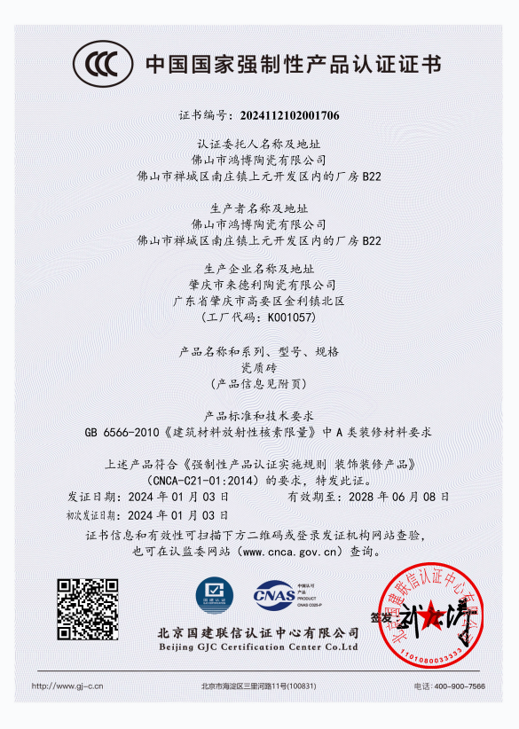 2024年1月3日,北京國建聯(lián)信認證中心有限公司(簡稱“國建認證“)為佛山市鴻博陶瓷有限公司頒發(fā)了瓷質磚CCC認證證書,這是國建認證施行CCC電子證書后頒發(fā)的首張認證證書。
