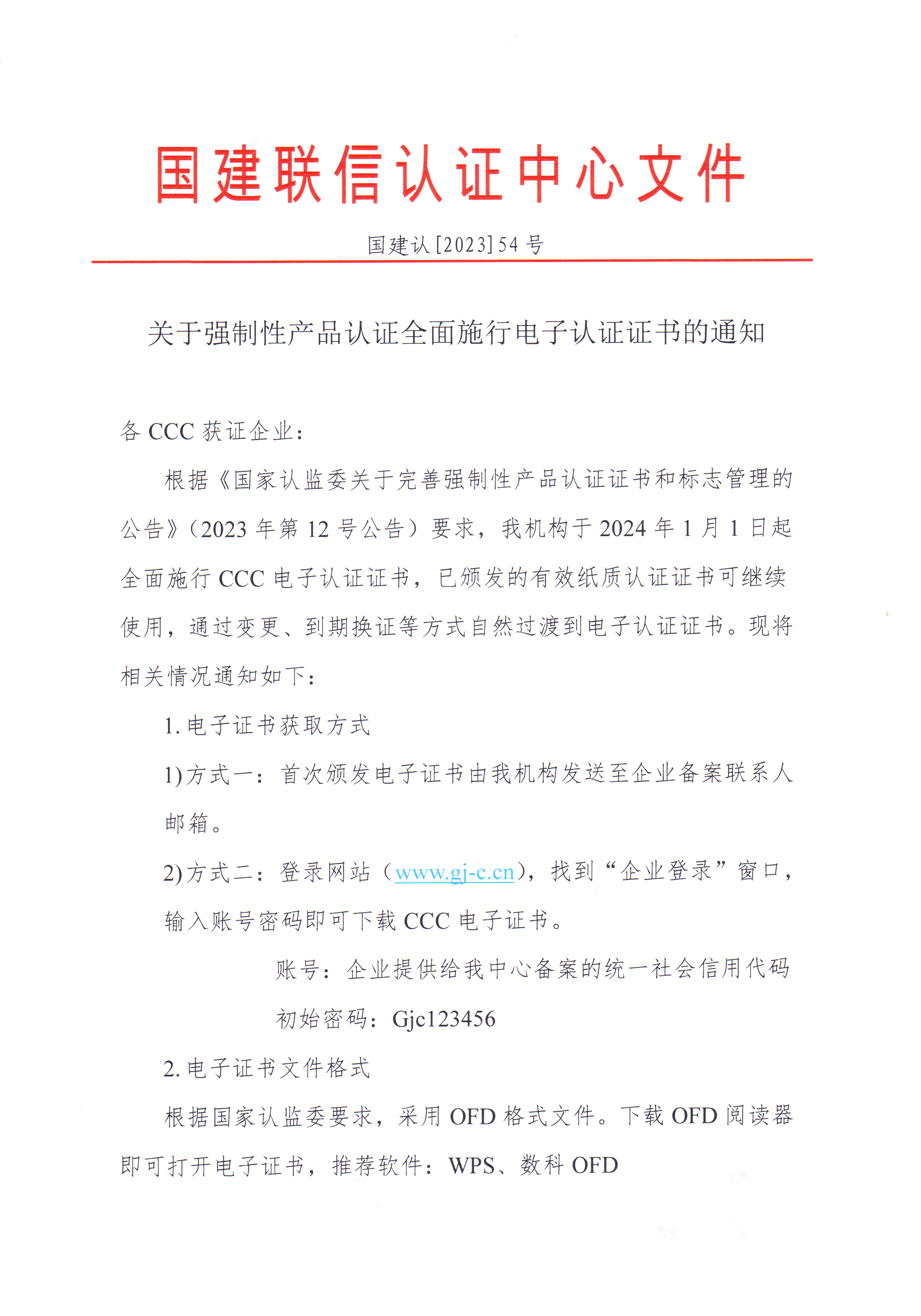 根據(jù)《國家認監(jiān)委關于完善強制性產(chǎn)品認證證書和標志管理的公告》(2023年第12號)要求,為確保公告中各項舉措的順利實施,國建認證積極研討制定并落實關于強制性產(chǎn)品認證電子證書的工作方案,已順利完成CCC認證電子證書系統(tǒng)部署、制作及防偽等各項工作,自2024年1月1日起CCC認證全面施行電子認證證書。