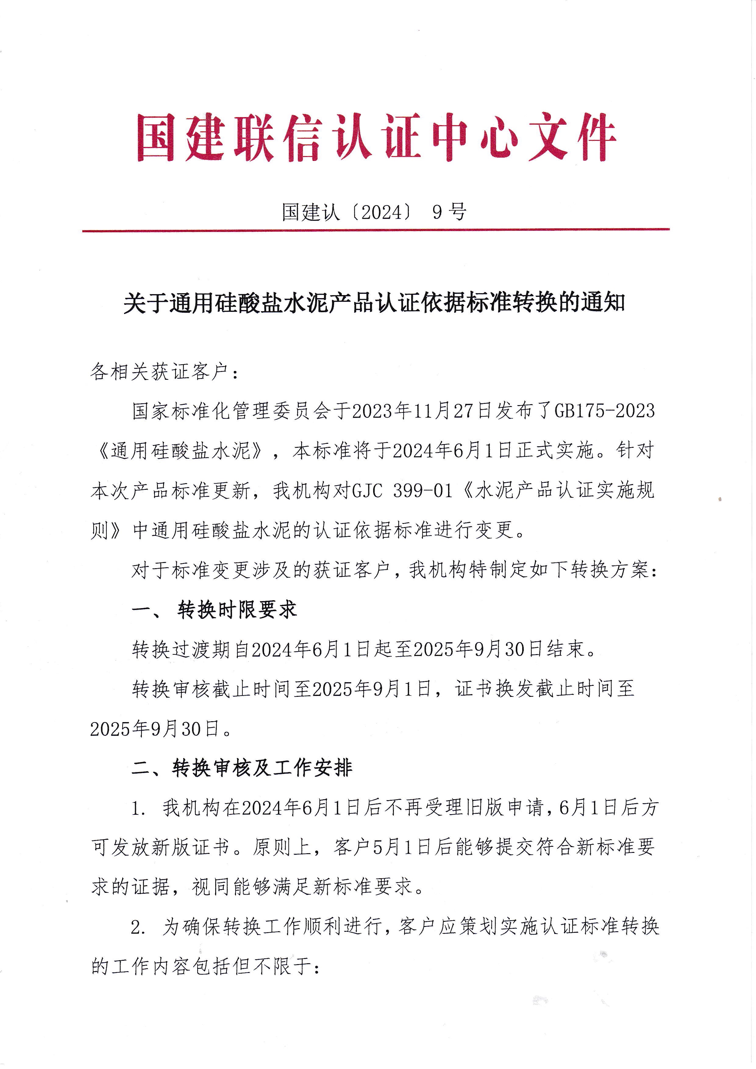 關(guān)于通用硅酸鹽水泥產(chǎn)品認(rèn)證依據(jù)標(biāo)準(zhǔn)轉(zhuǎn)換的通知